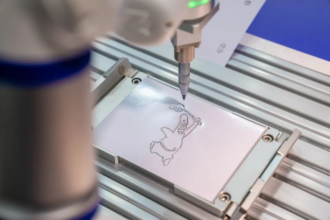 針對AI課程教學、人機互動表演等教育行業場景,艾利特繪畫機器人搭配攝像頭及上位機,可拍攝圖像并將其輪廓轉換為機器人軌跡數據,通過SDK接口向機器人發送。機器人對接收到的軌跡數據進行實時樣條插補,解決上位機軌跡數據不連續、通信延遲不可控的問題后,平穩柔順地完成繪畫動作。