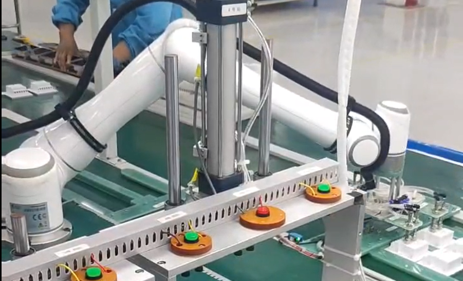 因此,客戶希望引入?yún)f(xié)作機(jī)器人來逐步替代人工進(jìn)行電源開關(guān)取放及檢測。艾利特協(xié)作機(jī)器人結(jié)構(gòu)緊湊、體積小巧、人機(jī)交互安全,成自動(dòng)化產(chǎn)線改造首選。