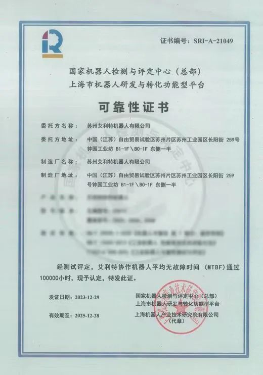 業(yè)內(nèi)首家!艾利特機(jī)器人通過MTBF 10萬小時(shí)認(rèn)證,協(xié)作機(jī)器人可靠性攀頂新臺(tái)階!