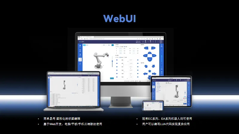 除了硬核的產(chǎn)品與技術(shù),艾利特在軟件生態(tài)方面依然是創(chuàng)新破局者。在2023年,艾利特全新推出了基于瀏覽器的WebUI示教軟件,可以在手機(jī)、平板、電腦跨設(shè)備協(xié)同操作,艾利特EC系列、EA系列均可適用,給協(xié)作機(jī)器人示教帶來新的玩法。