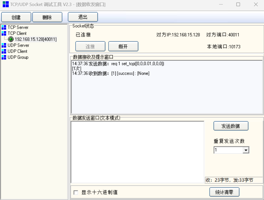 使用通訊助手創(chuàng)建客戶端,連接機器人40011端口,設(shè)置TCP參數(shù)