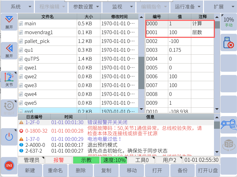 機器人在調試過程中經常會使用到全局變量和IO信號,在手動測試過程中為防止忘記變量和IO信號的功能,一般會在后面增加對應的注釋,EC示教器上的全局變量(D,B,I,V,P)均可以人為修改注釋(支持各類語言),數字IO,模擬量IO,M虛擬輸入和輸出也均支持修改注釋