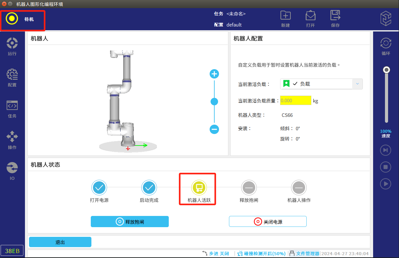 ● 機器人顯示”待機“狀態后退出,進入運行頁面,切換狀態