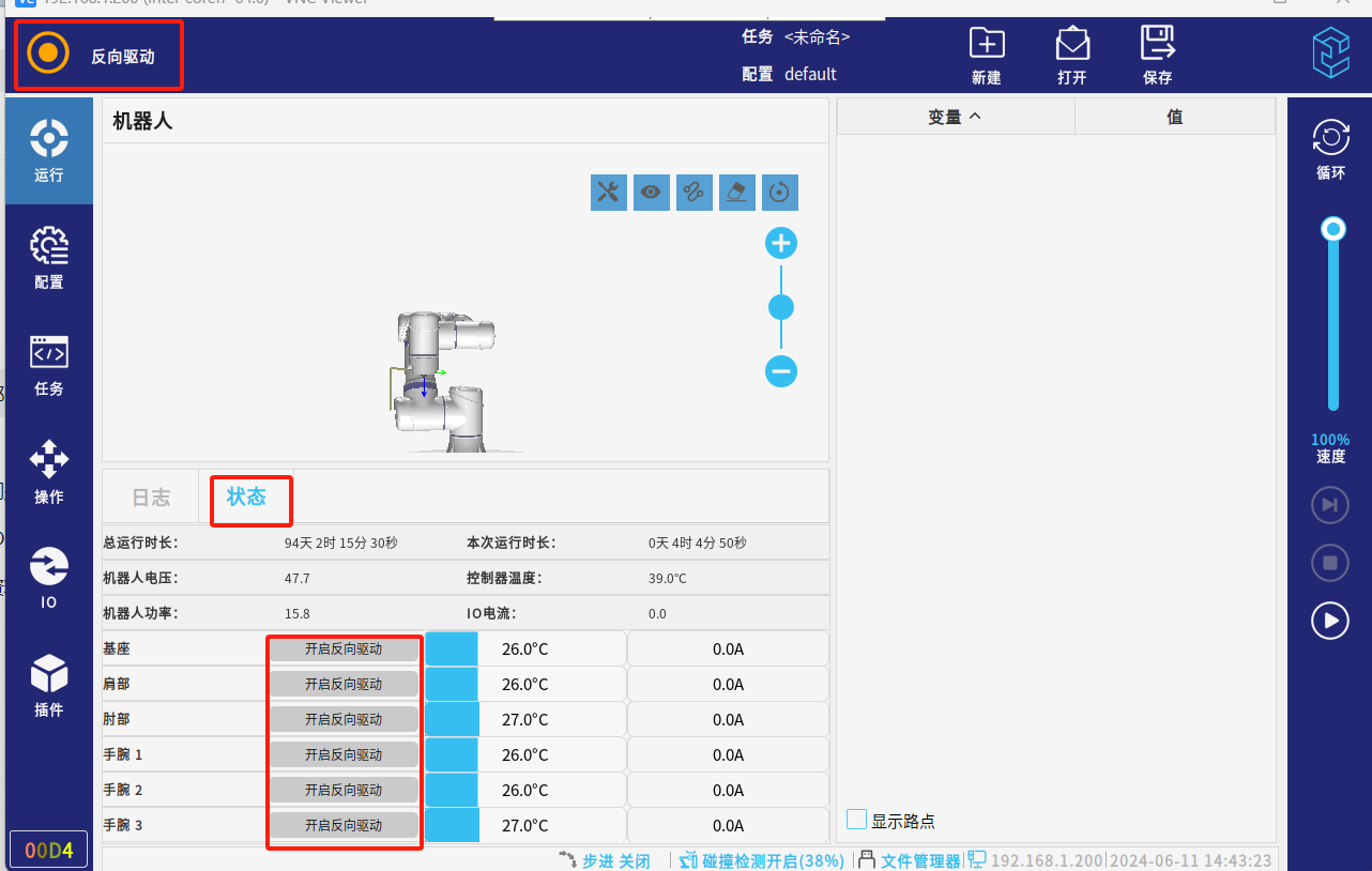 機器人撞機后由于和外部接觸一直反饋一定的扭力,機器人會一直報警不能進行移動和拖動情況下,需要進入反向驅動模式或關閉碰撞檢測。建議優先考慮使用“反向驅動”