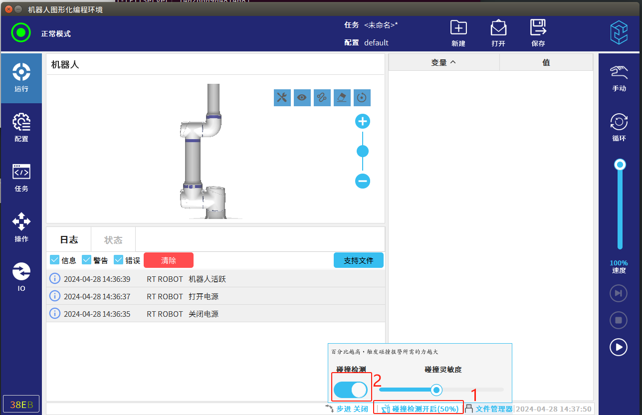 ● 關閉碰撞檢測時,必須盡可能減小機器人的運動速度移出碰撞區域,以避免不可預知的碰撞損傷。解決后需把碰撞檢測開啟。