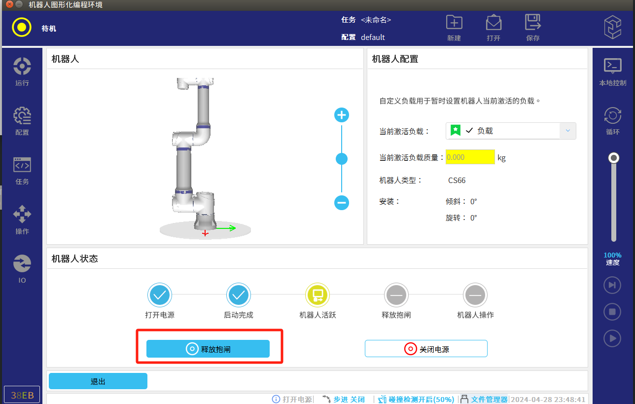 ● 將機器人移動到安全區域內,然后點擊 “釋放抱閘“。等待頁面左上角顯示“正常模式”,機器人可正常使用。