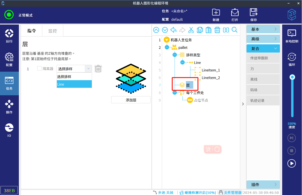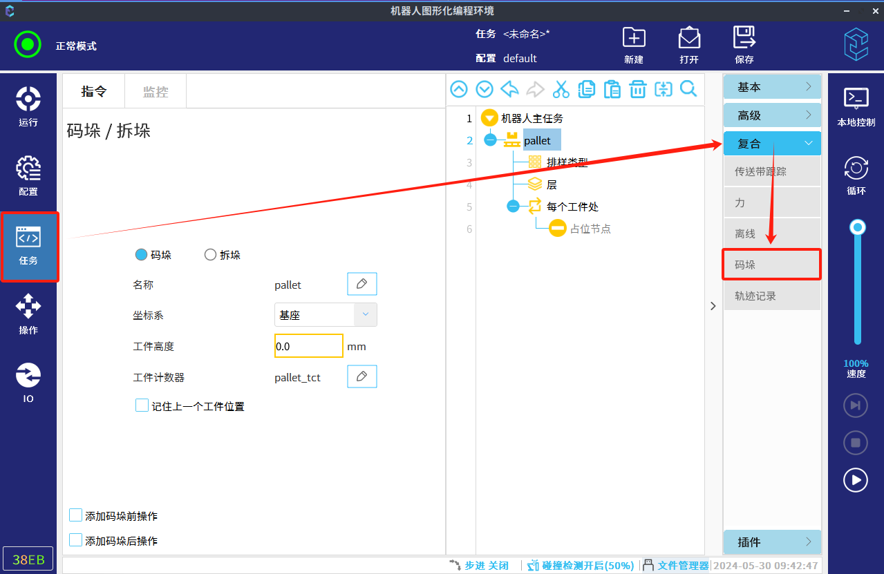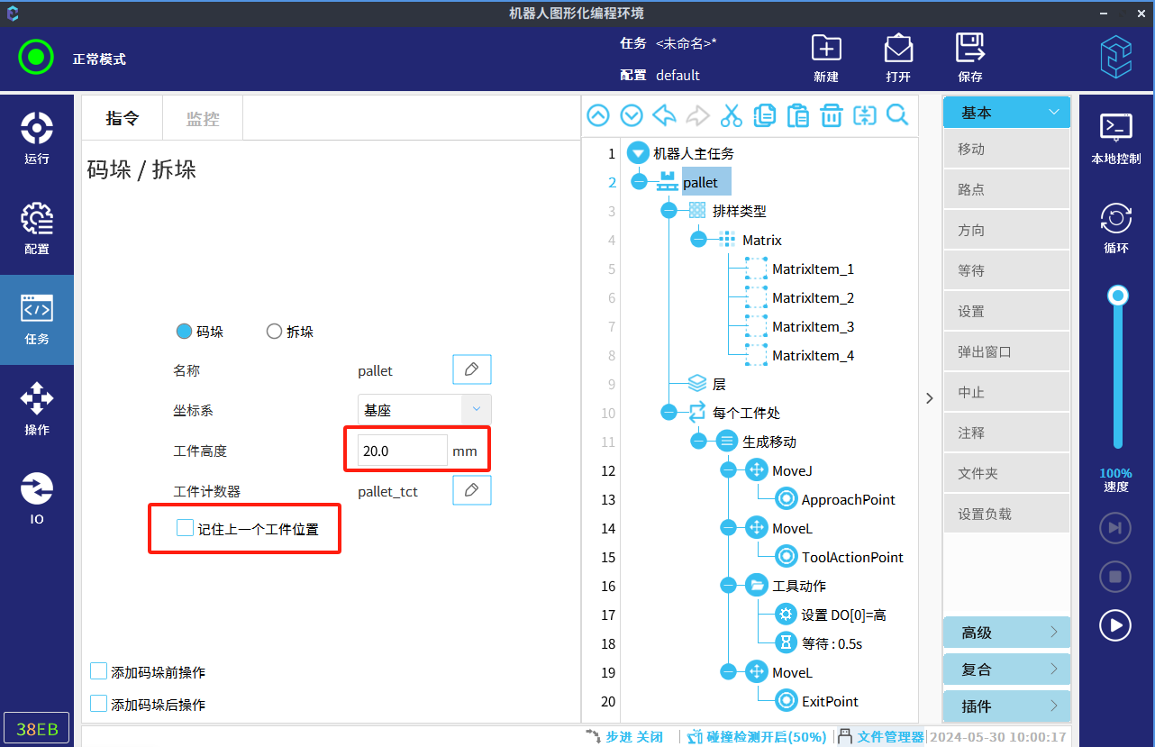 碼垛支持用戶自定義排樣類型、層數(shù)、參考點等,進行碼垛和拆垛任務的編寫。