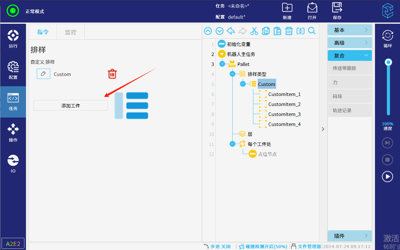 ● 自定義排樣:點擊自定義排樣節(jié)點,可重命名排樣類型的節(jié)點名稱,并添加或刪除“工件”節(jié) 點,自定義排樣是指在不規(guī)則的碼垛情況下,用戶需自己示教該層點位。