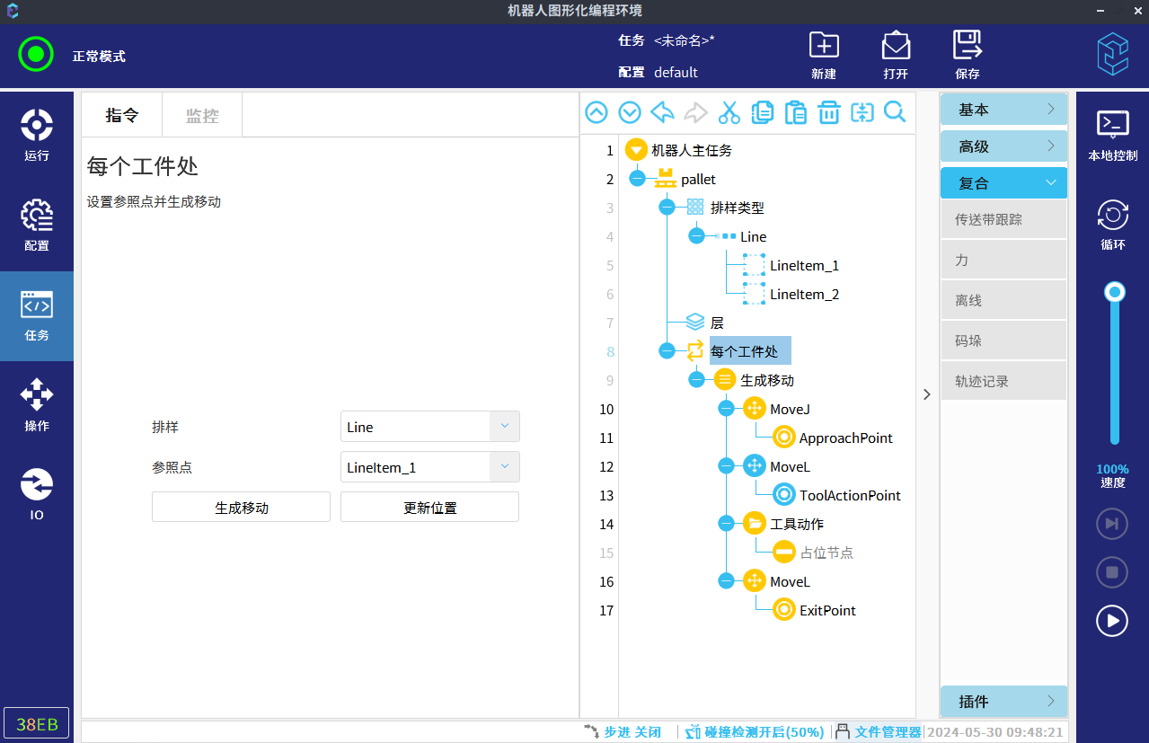 在“生成移動”節(jié)點下,設置接近點、工具動作點、工具動作以及離開點。設置完成后,工具將對每個工件重復這些動作。