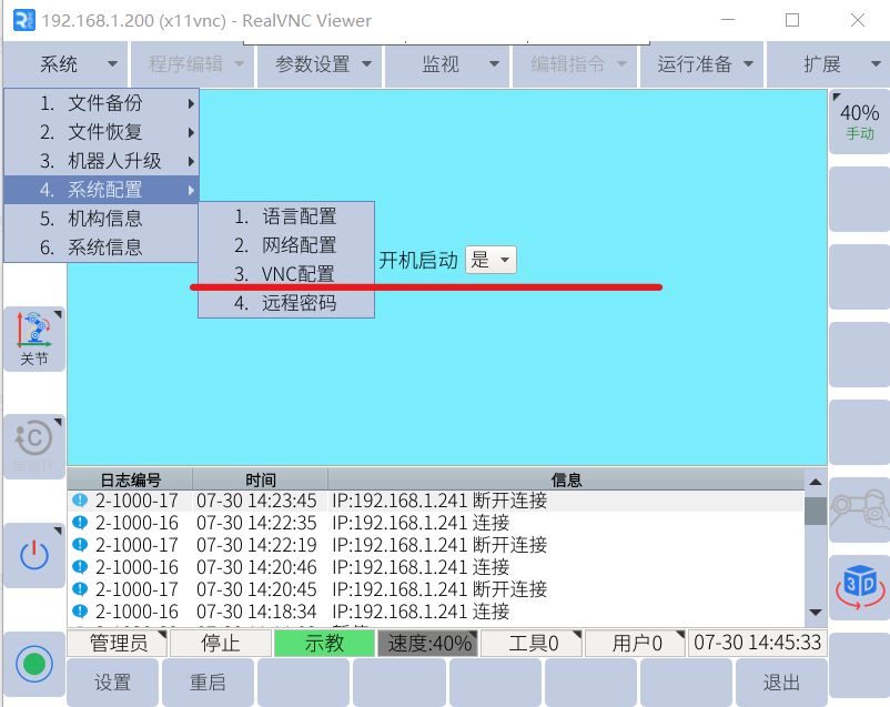 3. 機器人側在系統(tǒng)配置-VNC配置中,修改為開機啟動并設置,同時點擊啟動按鍵,當示教器窗口出現(xiàn)VNC已啟動和VNC設置成功后即可。