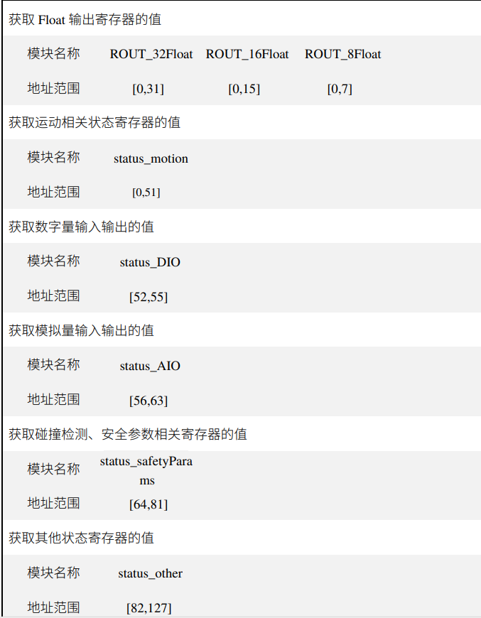9. 具體寄存器詳細(xì)功能(比如想獲取機(jī)器人當(dāng)前位姿或者角度以及系統(tǒng)狀態(tài)這種) 可查找通信協(xié)議手冊(cè)。
