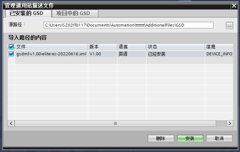 將下面鏈接的艾利特機(jī)器人GSD 文件安裝到 TIA PORTAL 中管理通用描述文件,如圖 2-2 所示。