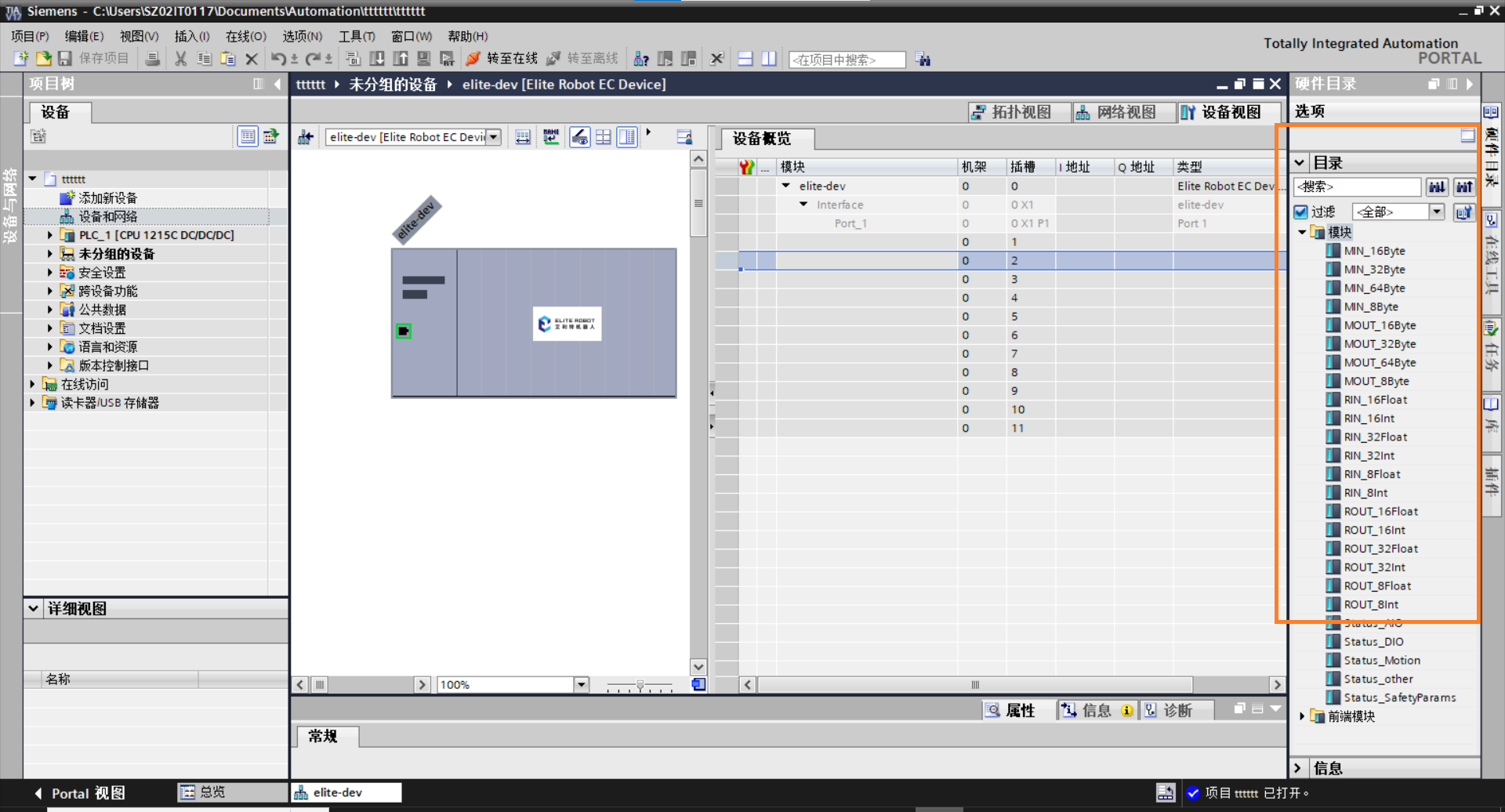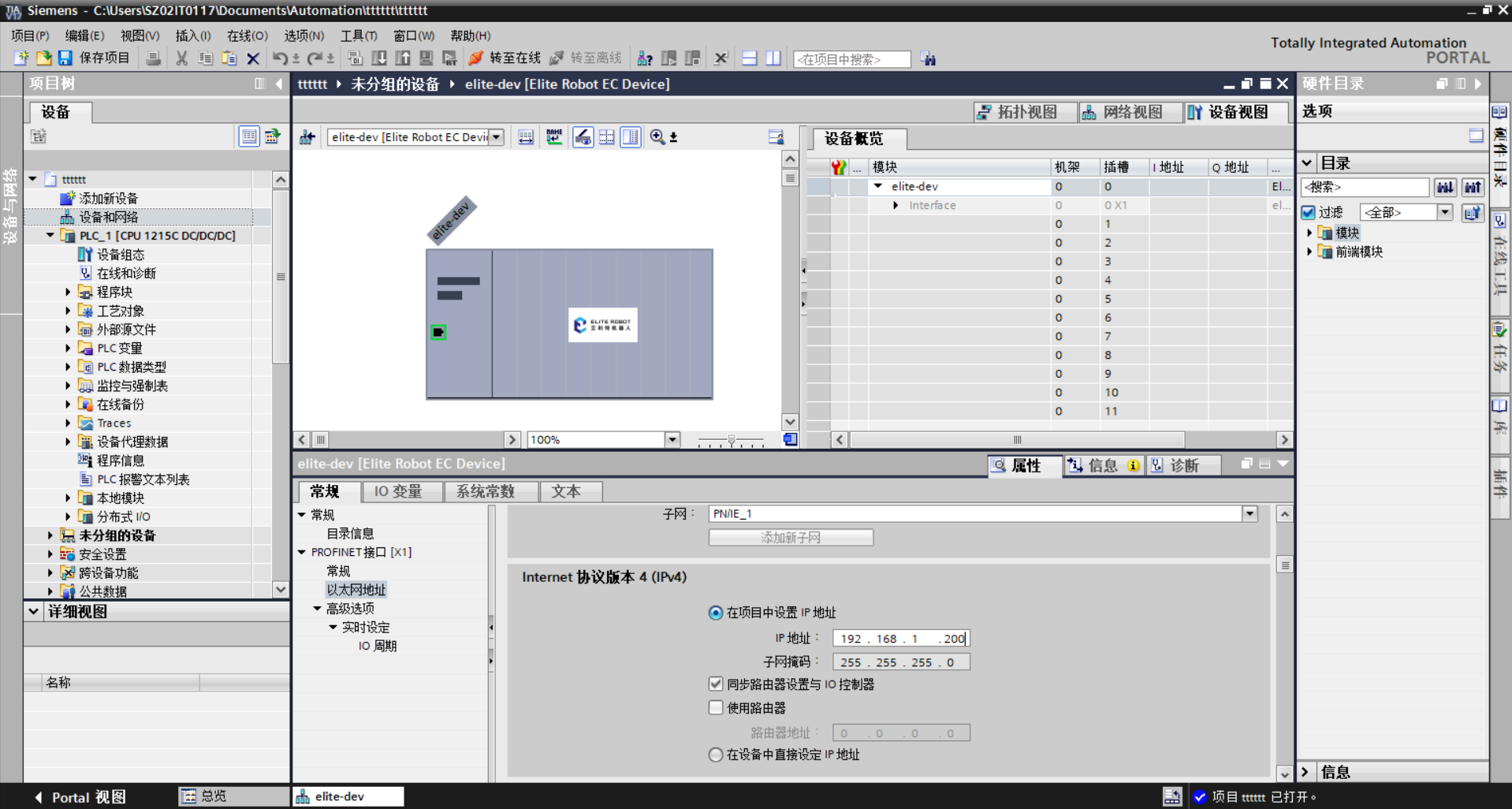 2. 添加 Elite Robot EC Device 到設(shè)備和網(wǎng)絡(luò),點(diǎn)擊左側(cè)設(shè)備和網(wǎng)絡(luò),進(jìn)入頁面,在右側(cè)目錄欄找到其他現(xiàn)場(chǎng)設(shè)備-profinetI/O-IO-elite,找到elite robot EC Device如圖 3-3 所示。