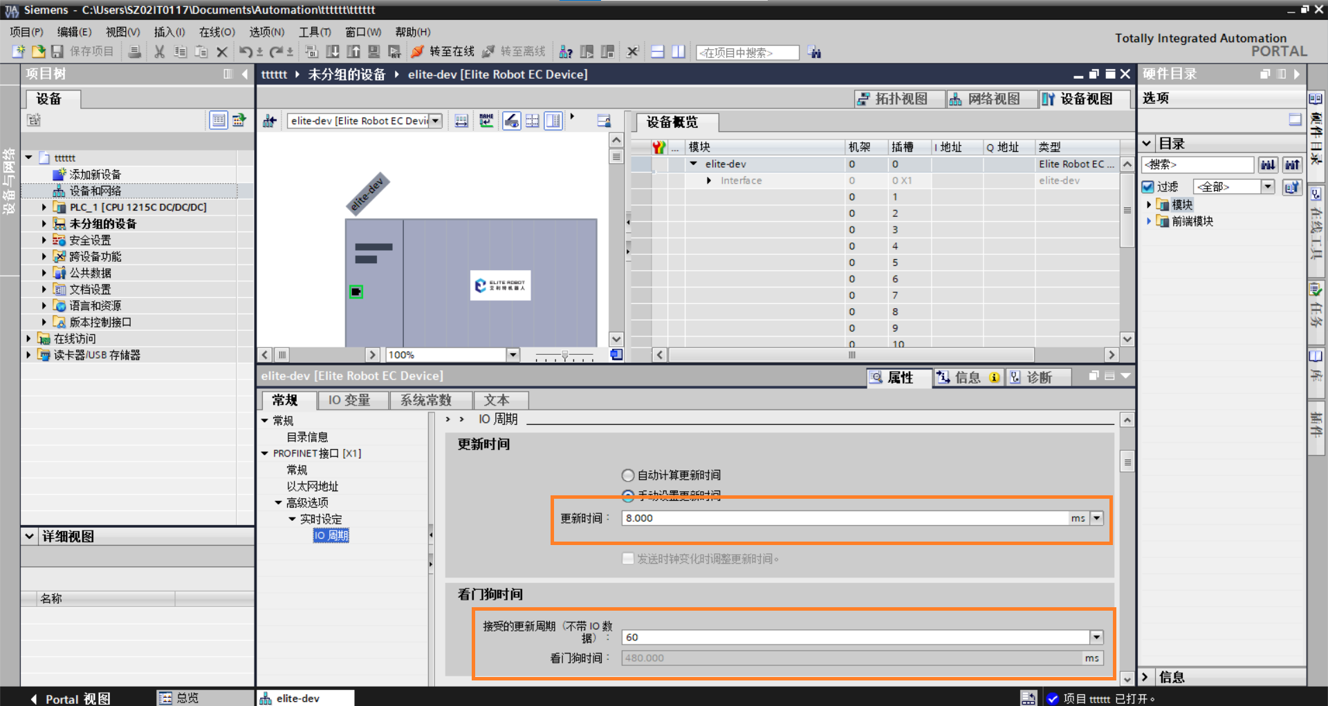 4. 雙擊 Elite Robot EC Device 設(shè)備的屬性中設(shè)置 IP 地址和 IO 周期,如下圖所示。