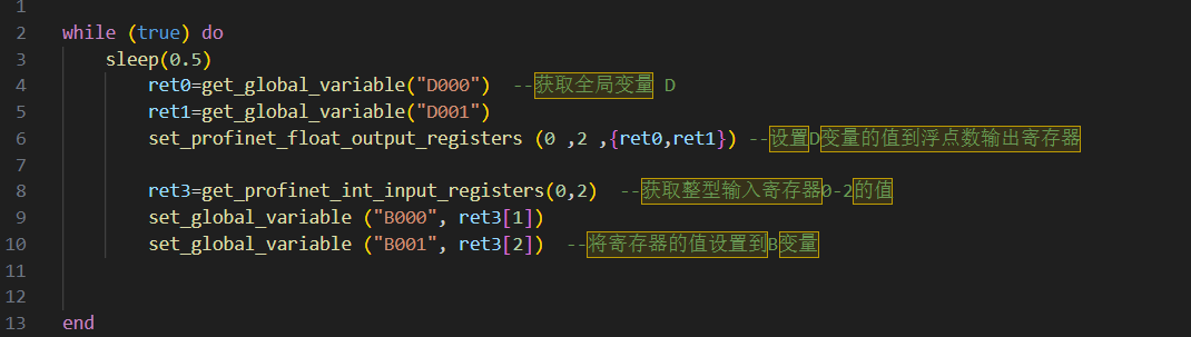 此腳本為簡(jiǎn)單的示例腳本,機(jī)器人將D變量浮點(diǎn)數(shù)傳到PLC對(duì)應(yīng)地址前兩個(gè)寄存器,plc將兩個(gè)正整數(shù)傳入機(jī)器人B變量。更多腳本指令,請(qǐng)查找EC腳本手冊(cè)profinet通訊章節(jié)。