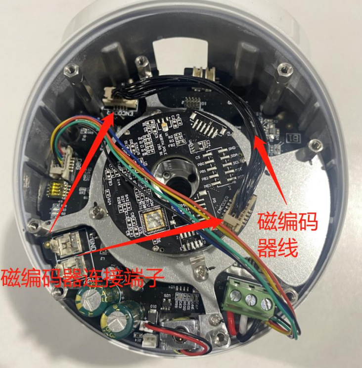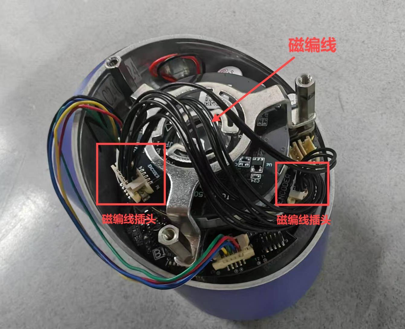 機(jī)械臂關(guān)機(jī)斷電,拆下報警關(guān)節(jié)端蓋,檢測磁編碼器線纜是否脫落,以及線纜是否斷裂或者被擠壓變形。如果有上述情況,先重新插拔磁編線建議更換磁編線。如果無上述情況,請進(jìn)行下一步排查。