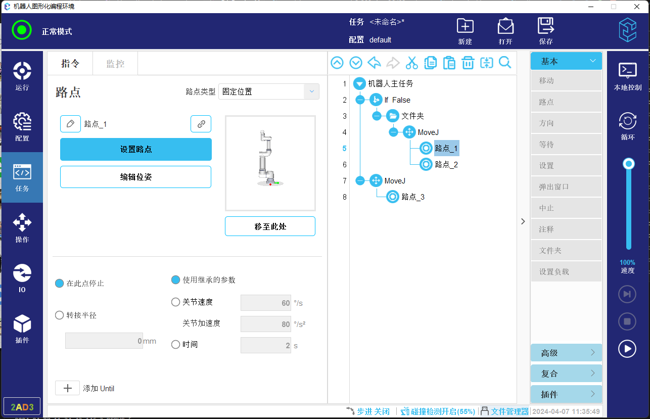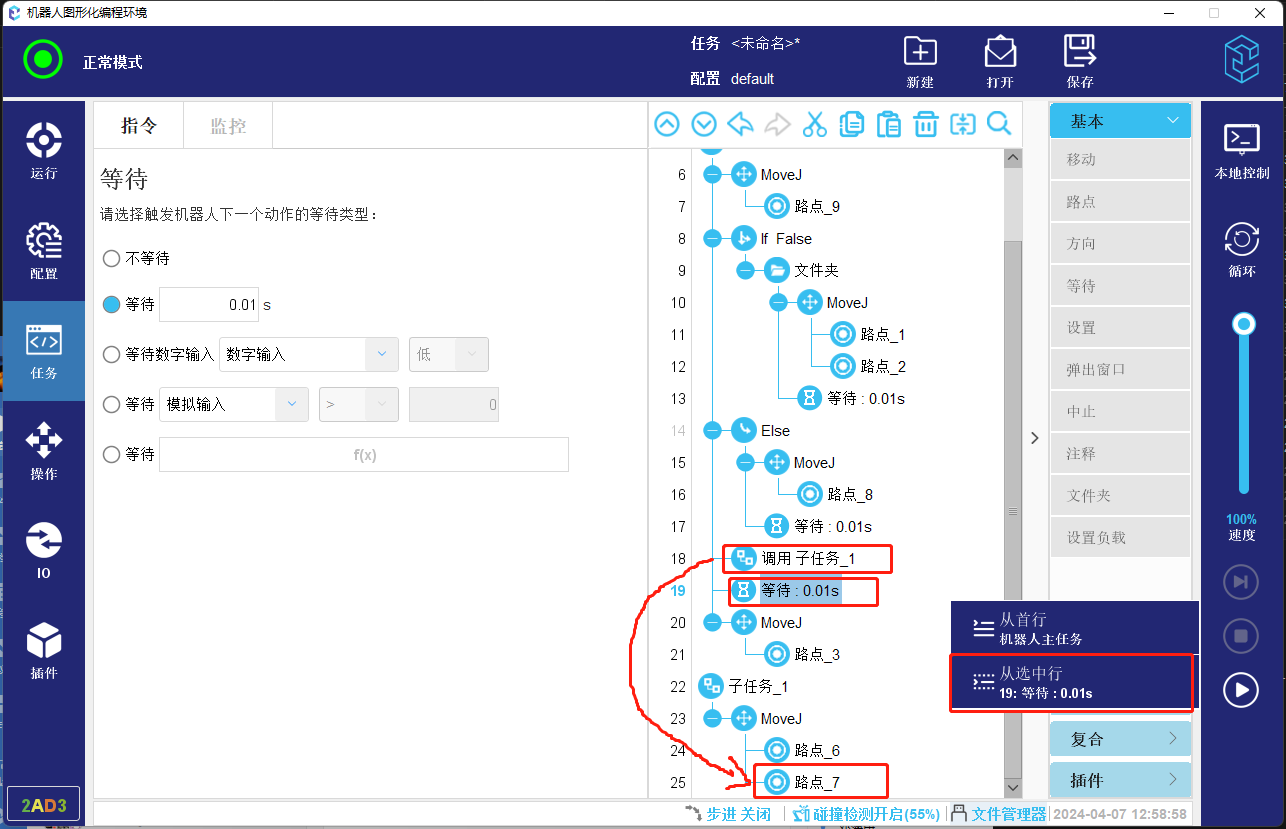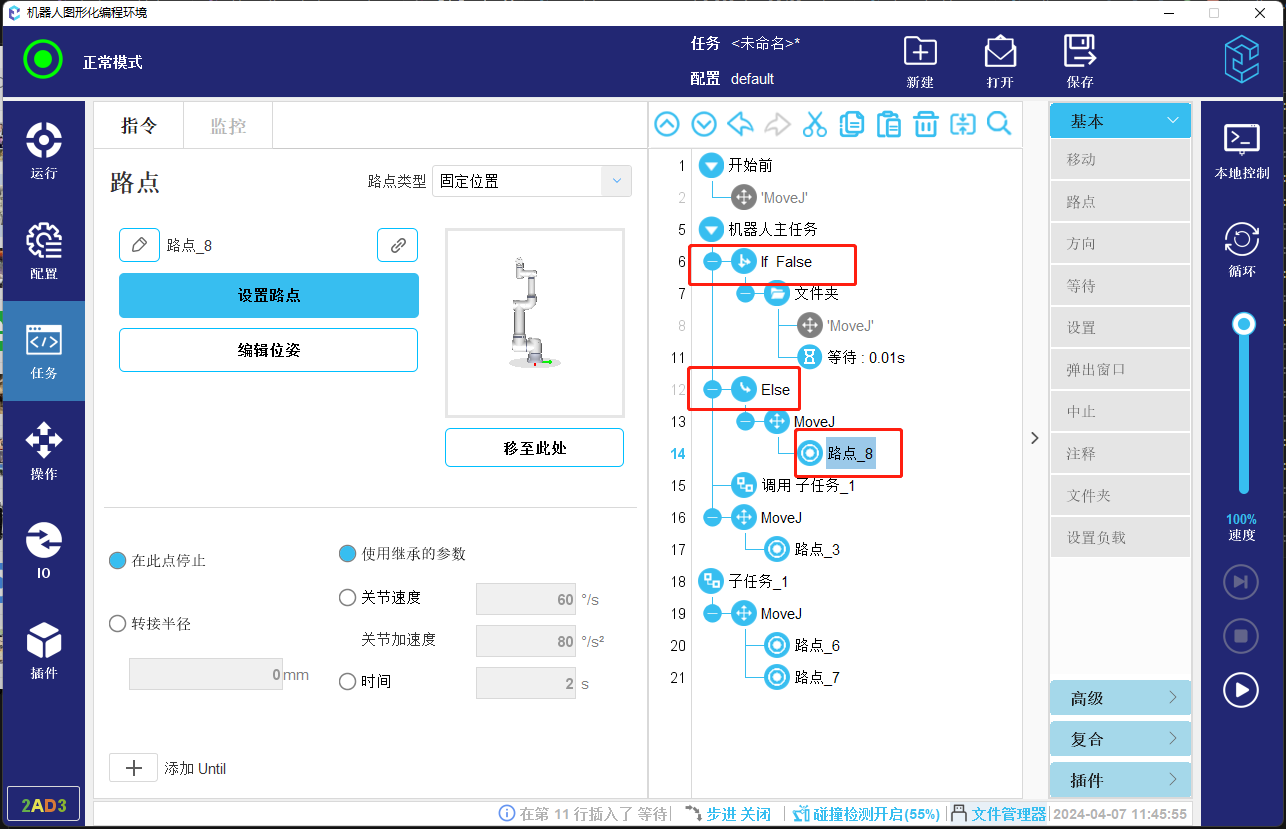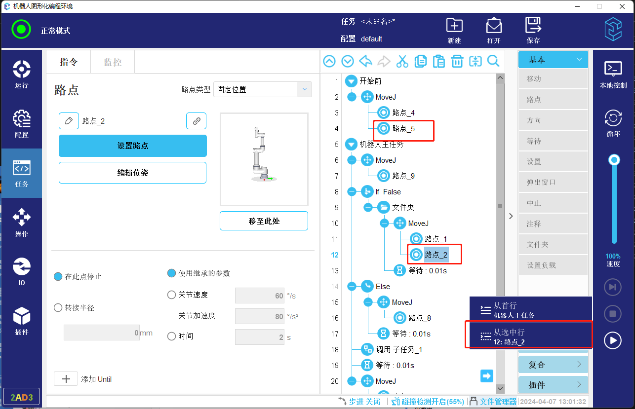 4. 如果當前選中的任務節點上方無可以運行到的節點并且內部也沒有可以運行到的點,則會直接開始運行,不再繼續向后考慮支持運行到的路點。所以下方圖-13所示程序會支持開始運行,不會已路點_4作為起始位置。