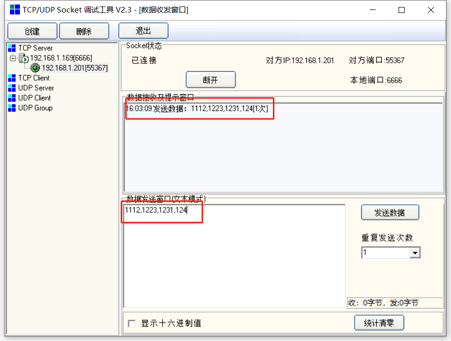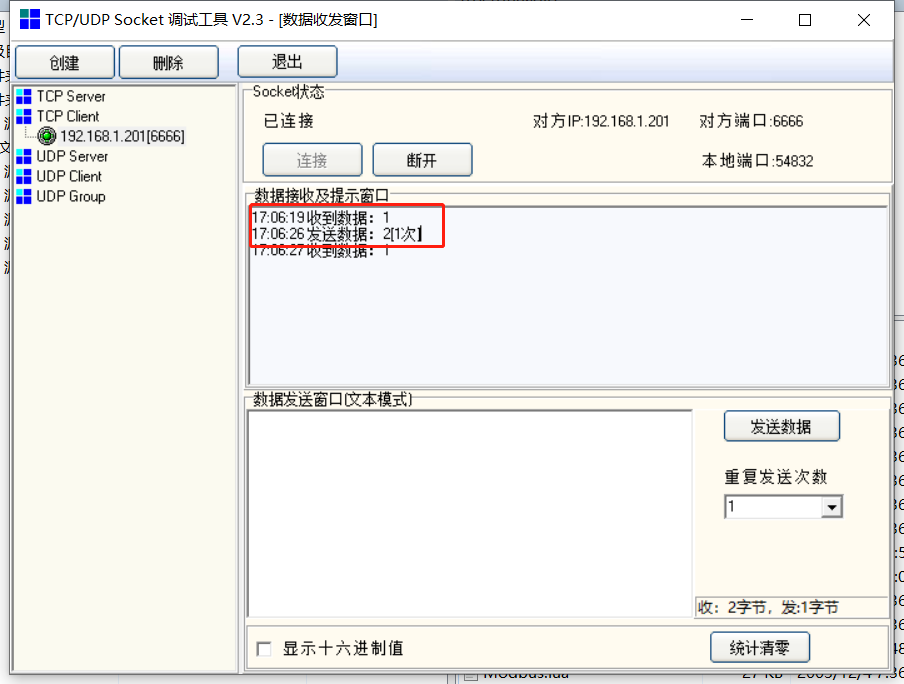 連接上后,機(jī)器人會(huì)發(fā)送字符串“1”給客戶端,通訊助手上接收到數(shù)據(jù)