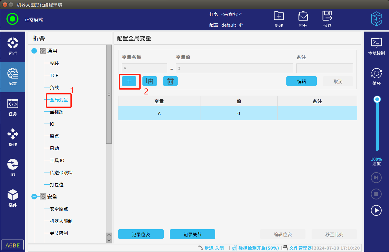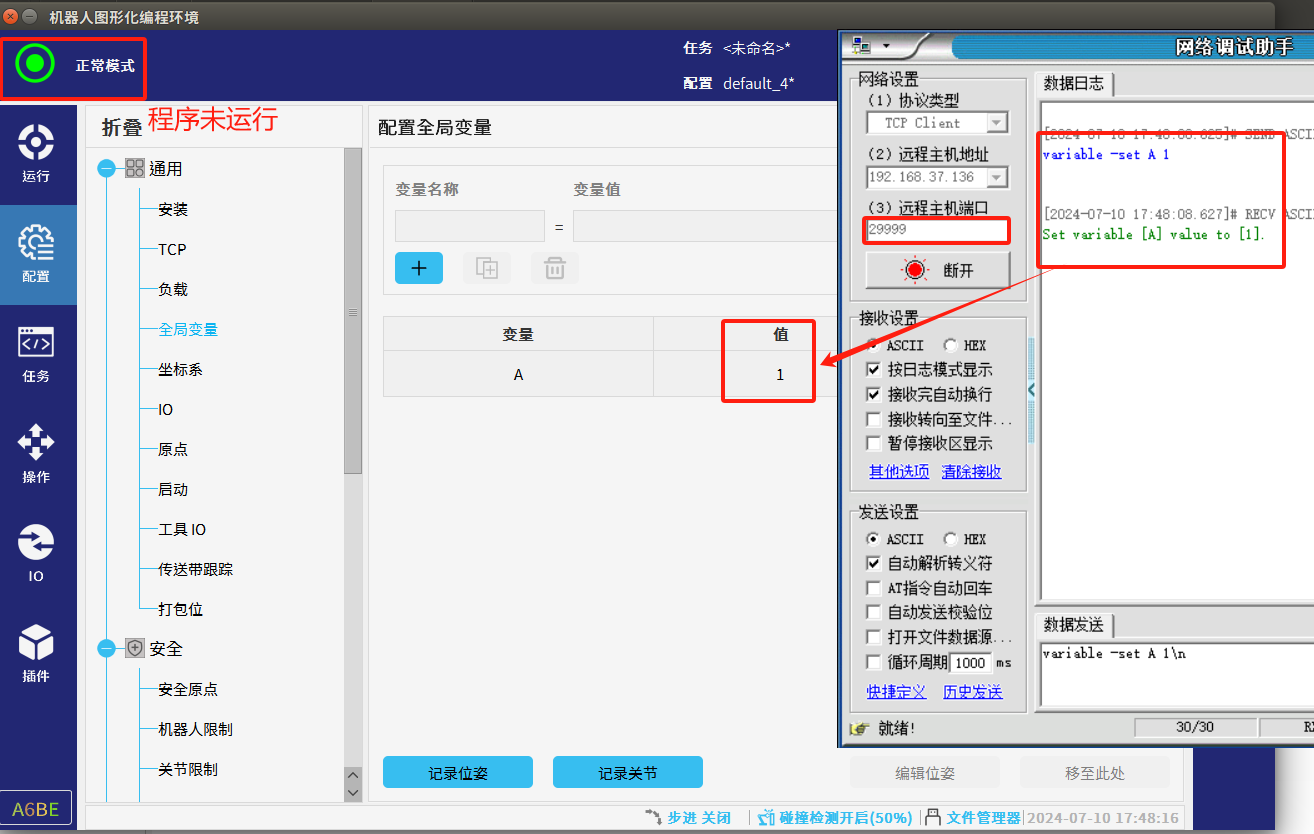 2. 使用30001端口修改全局變量時,需要定先義一個與機器人端名稱一模一樣的全局變量。