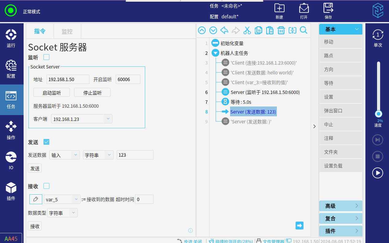 選擇導航欄“任務”-指令欄選擇“插件”-點擊"Socket Server"-設置該指令(勾選“發送”-輸入對應的數據類型)可以手動點擊”發送“,也可以直接”運行任務“來發送