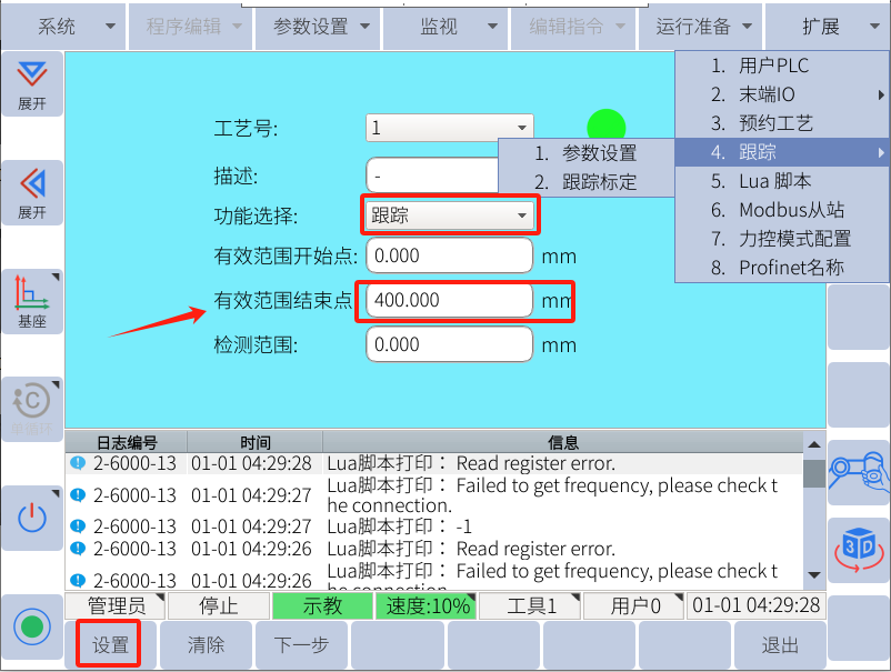 然后可以在 擴展--跟蹤 中設定傳送帶跟蹤參數和跟蹤標定