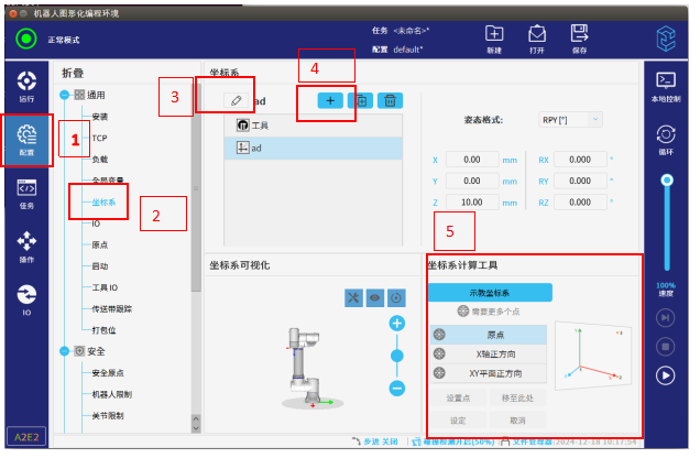 第二步:進(jìn)入機(jī)器人配置→坐標(biāo)系→添加新的用戶坐標(biāo)系(新坐標(biāo)系命名需要是英文)→示教坐標(biāo)系。(具體操作步驟請(qǐng)看圖-1紅色數(shù)字標(biāo)記處)