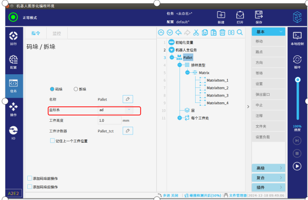 第一步:在機(jī)器人主任務(wù)里插入一個(gè)碼垛指令,坐標(biāo)系選擇新建的用戶坐標(biāo)系(如圖-2紅框標(biāo)記處)。