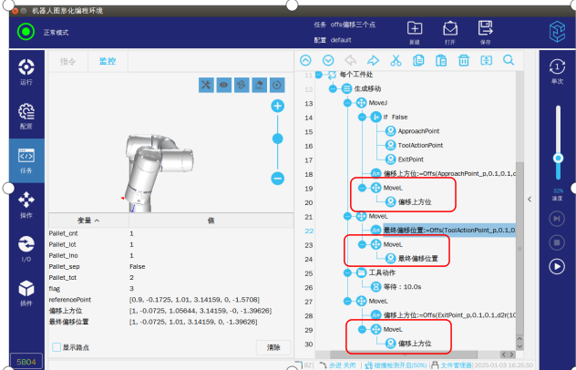 2.2.1將碼垛工藝包里3個(gè)運(yùn)動(dòng)點(diǎn)位都按照外部偏移值偏移(進(jìn)入點(diǎn),工具動(dòng)作點(diǎn),離開點(diǎn))