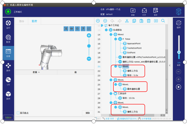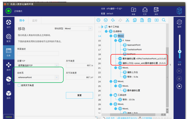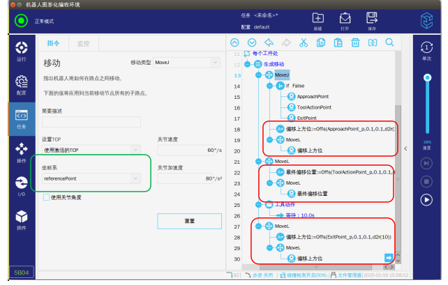- 使用2.2(方法2)進(jìn)行偏移時(shí)要重新插入一個(gè)movel運(yùn)動(dòng)指令,然后將偏移點(diǎn)位放在新插入的運(yùn)動(dòng)movel指令下(如圖-6和圖-9紅框標(biāo)記所示)。