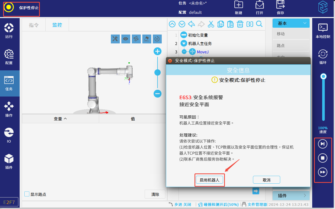機器人末端TCP超過安全平面時會進入到恢復模式;正常情況下機器人會在接近安全平面時就會暫停運行,此時會進入保護性停止,機器人會暫停程序,此時只需點擊啟用機器人即可
