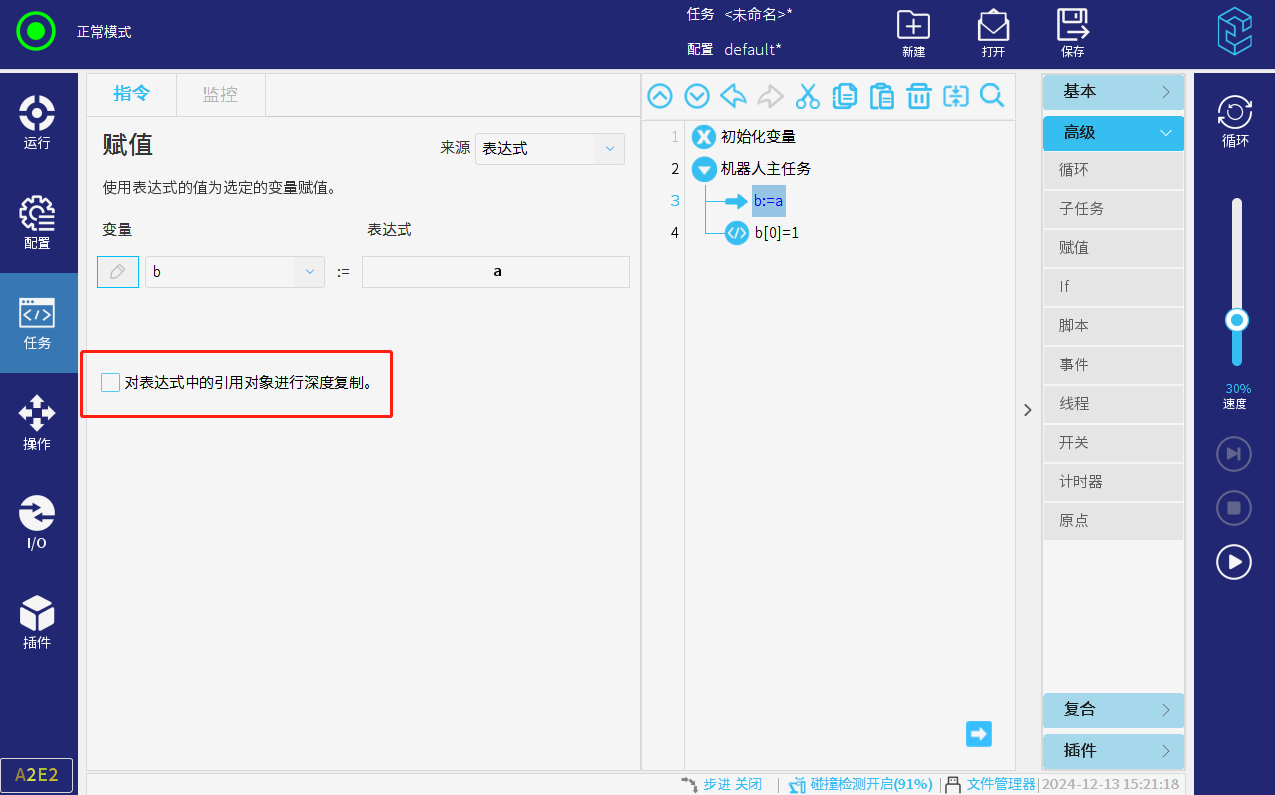 任務中添加下圖程序程序,將數組a賦值給數組b,再修改b數組的值,不勾選深度賦值
