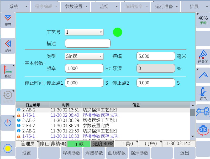 頻率表示1s內Sin焊接的周期個數(0-20Hz),例如:頻率為4Hz表示機器人在1s內要做4個周期的Sin焊接動作。