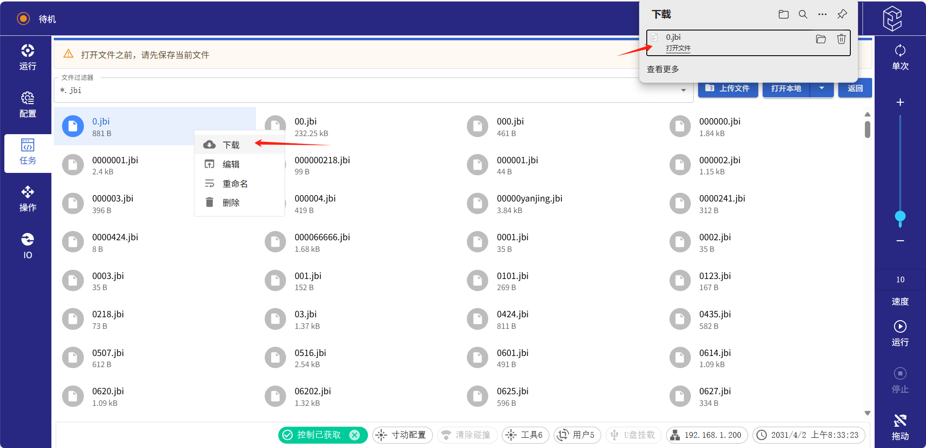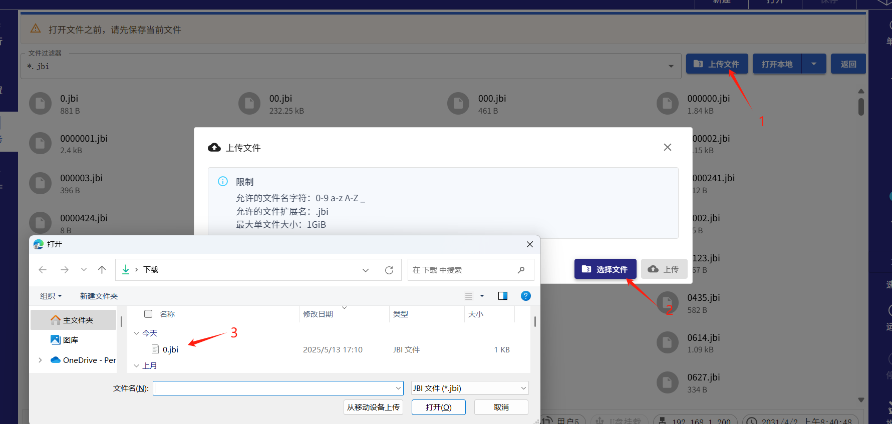 ● 備份:點(diǎn)擊右上角“打開(kāi)”,進(jìn)入文件頁(yè)面。如下圖顯示JBI文件,找到對(duì)應(yīng)JBI文件名,鼠標(biāo)右鍵選擇下載。