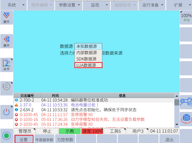 擴(kuò)展-力控模式配置-選擇LUA數(shù)據(jù)源-設(shè)置數(shù)據(jù)間隔和容差-點(diǎn)擊設(shè)置 。