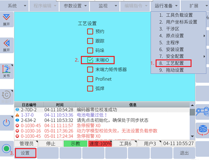 運(yùn)行準(zhǔn)備-工藝配置-勾選末端IO-設(shè)置,重啟后生效(注意:不要勾選末端力矩傳感器)。