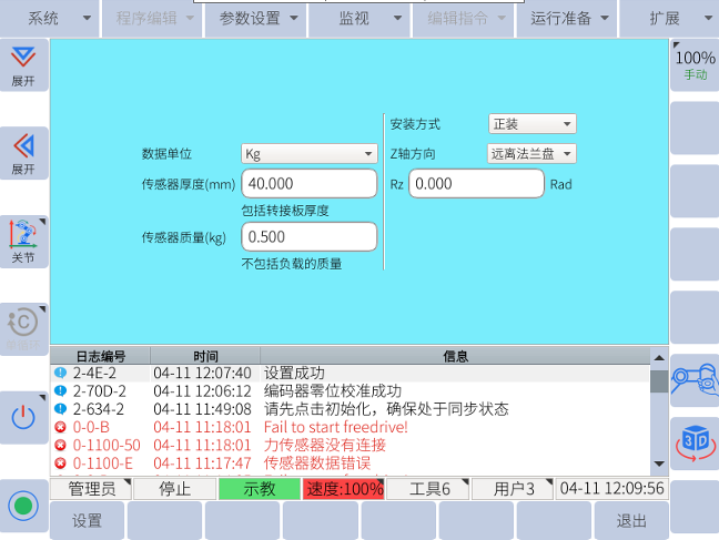 以上步驟完成后,可以點(diǎn)擊監(jiān)視-力控傳感器數(shù)據(jù),若以上步驟都正確,則傳感 器數(shù)據(jù)在不斷變化,可施加不同方向的力,看力的方向是否和法蘭坐標(biāo)系一致, 后續(xù)的步驟可參考用戶(hù)手冊(cè)_3.10.2力控功能章節(jié)進(jìn)行傳感器標(biāo)定,負(fù)載辨識(shí)及負(fù)載慣量辨識(shí)。設(shè)置完成后即可正常使用。