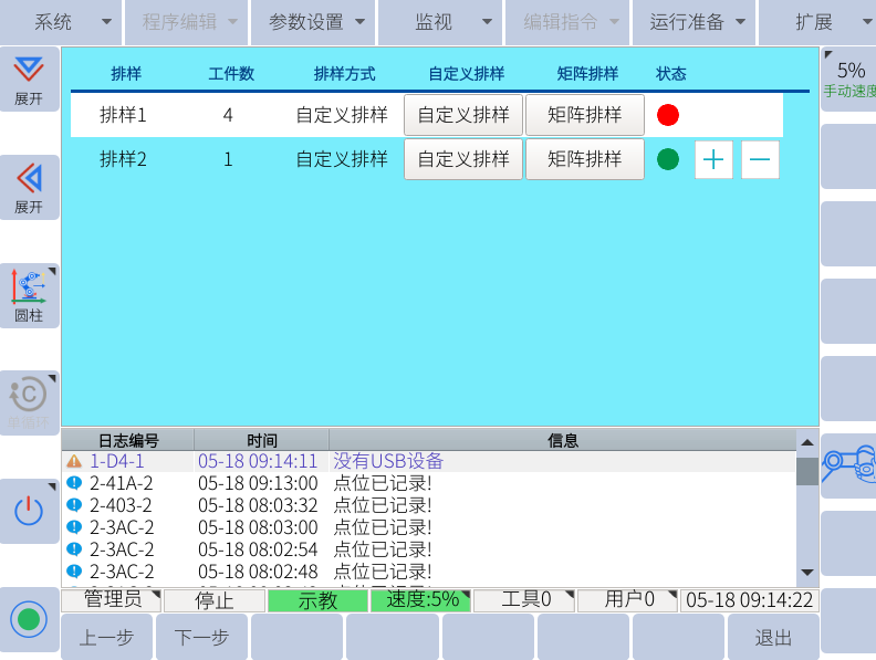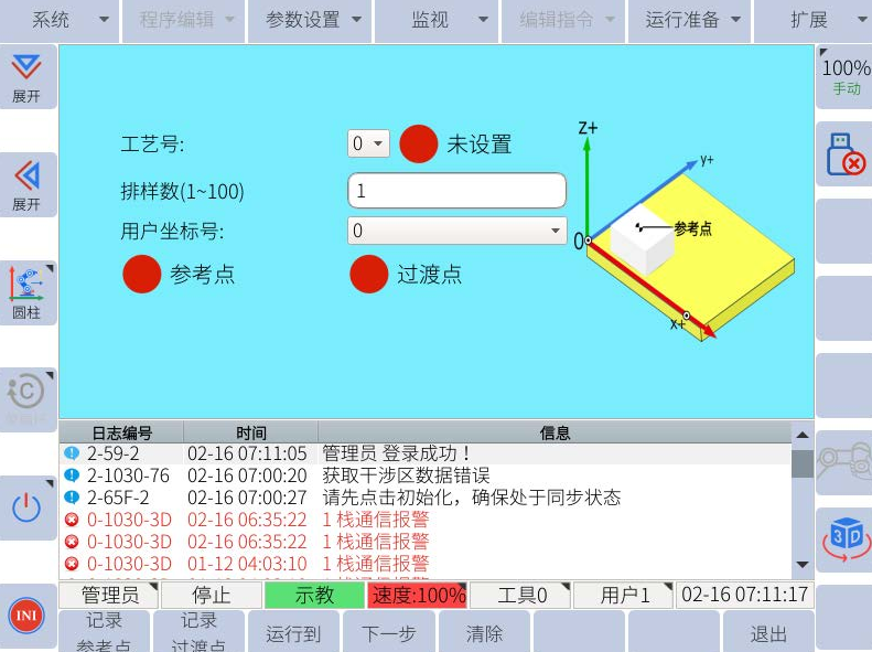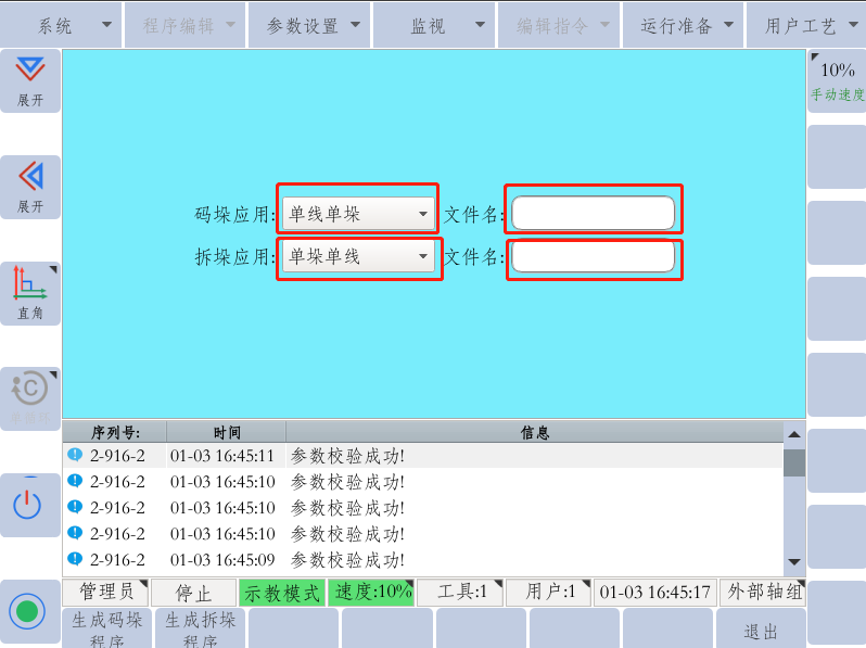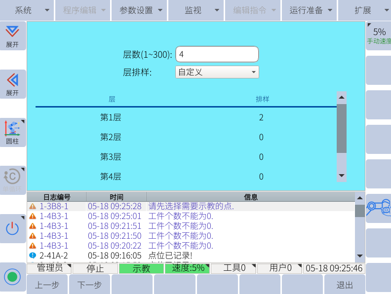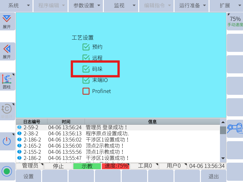 1.  進入管理員模式,選擇運行準(zhǔn)備-----8. 工藝配置-----勾選碼垛,點擊左下角的設(shè)置,重啟后,在右上角的擴展里面會有碼垛工藝配置。