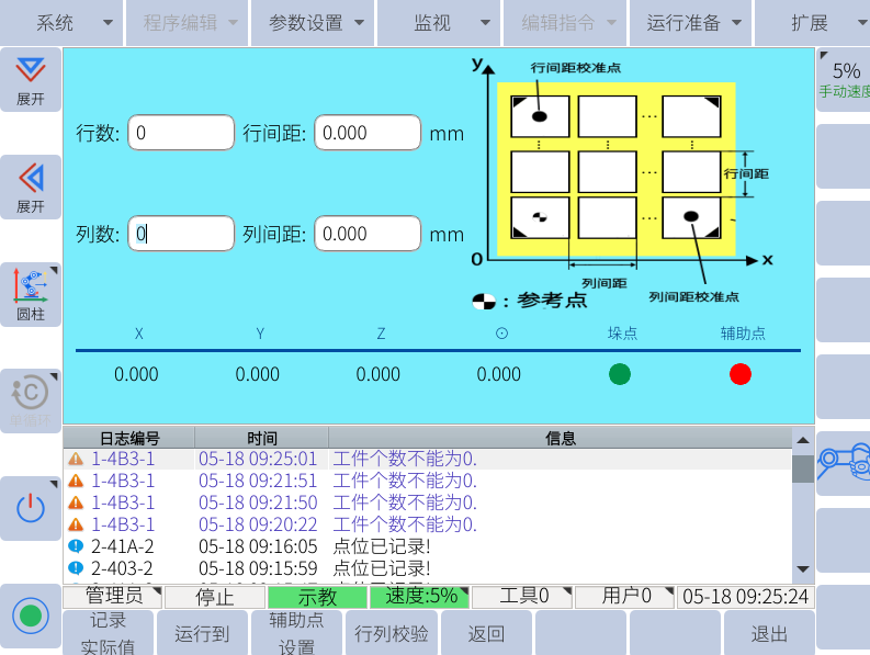 5.  矩陣排樣需要確定好行數(shù),可以自己測量行列間距,然后自行填寫,以毫米為單位。也可以使用行列效驗,系統(tǒng)計算出來。注意區(qū)分行校準(zhǔn)點和列校準(zhǔn)點,這兩個是反的。
