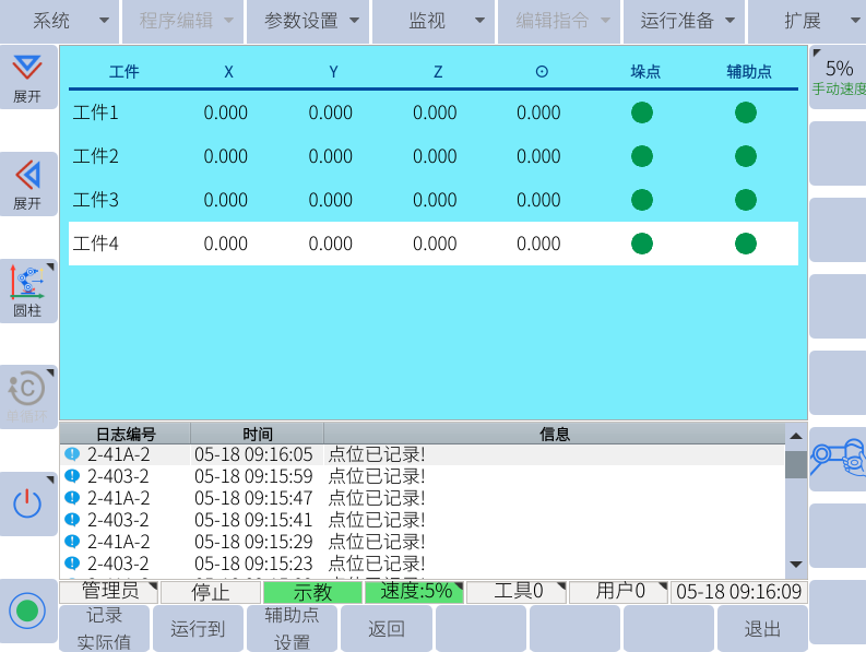 3. 設(shè)定工件坐標(biāo)值使用“記錄實際值”的方法時,在示教過程中務(wù)必保持 Rx、Ry 的角度