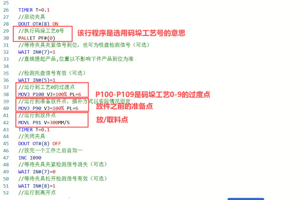 單線單垛:表示機器人從一固定的點位取料,將工件碼放在一個托盤上。示例程序中標(biāo)注可選的部分可根據(jù)實際 情況進行刪減。
