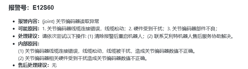 2. 數(shù)字釋義:“12” 指代伺服報警;“60” 明確為 {joint} 關節(jié)編碼器讀取異常。