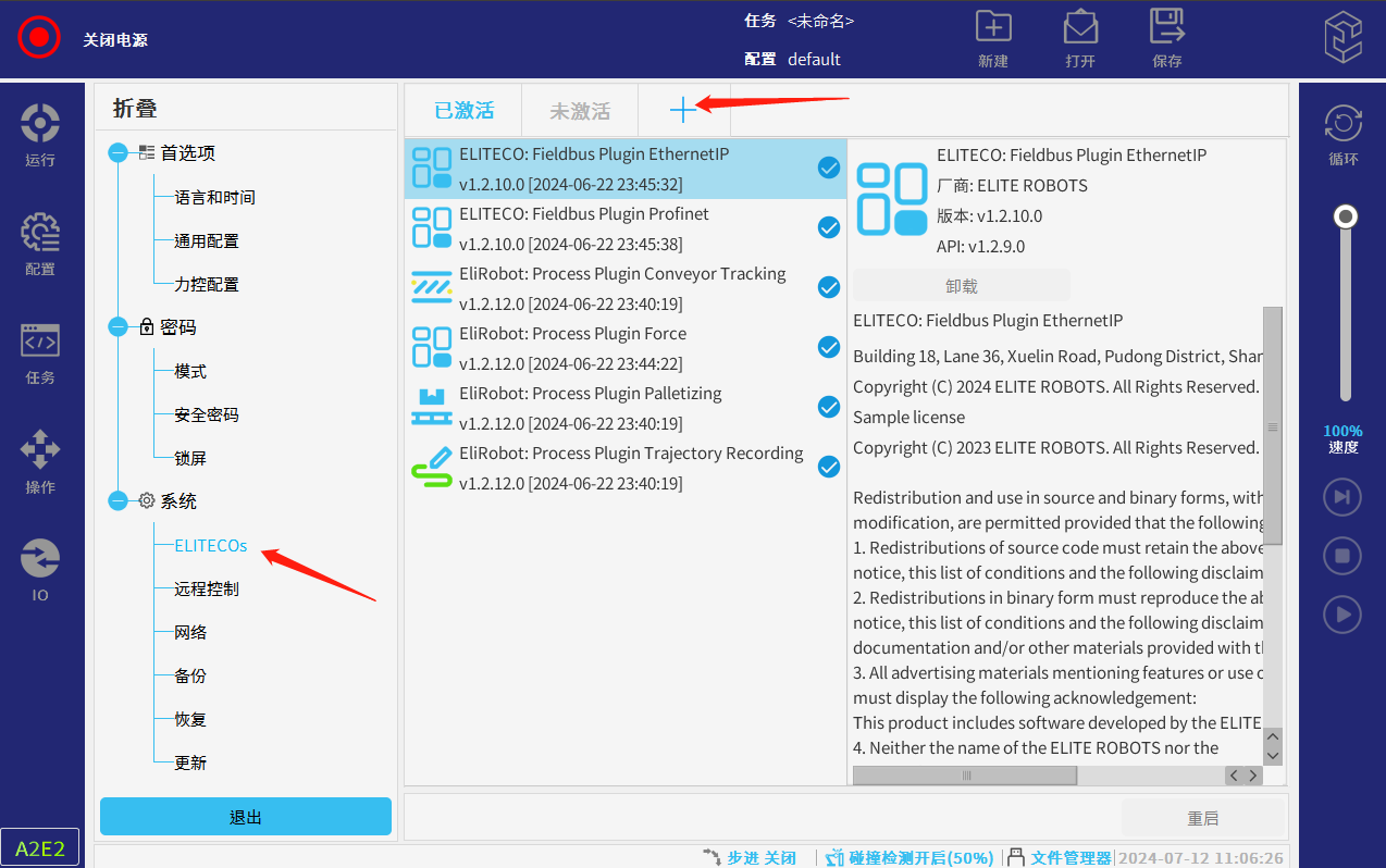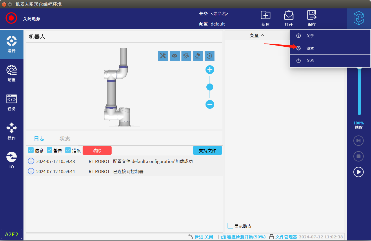 2. 打開機器人軟件后,點擊右上角艾利特log點擊設置。