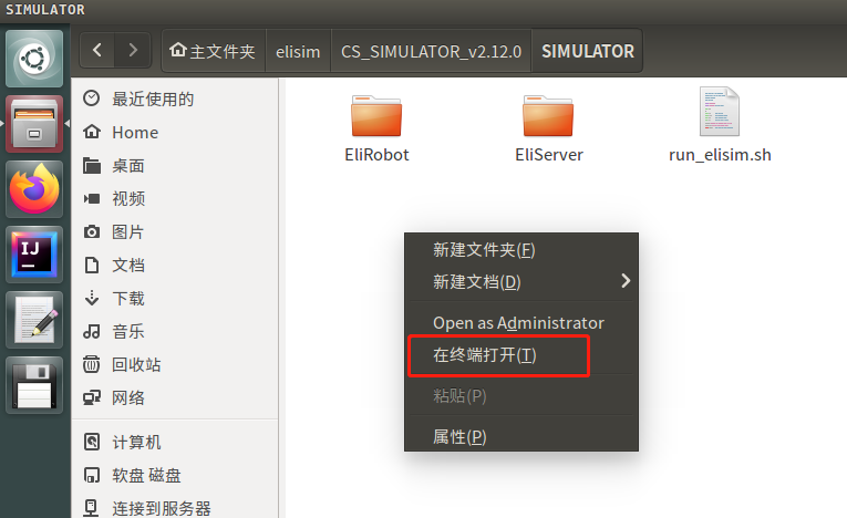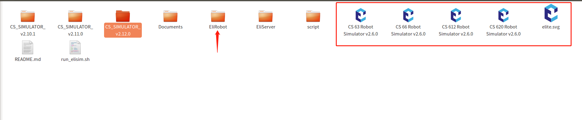 1. 退回到 SIMULATOR 目錄下( elisim-CS_SIMULATOR_V2.12.0-SIMULATOR)右擊鼠標,選擇在終端打開。輸入 ./run_elisim.sh或者點擊Tab鍵補全,點擊回車,打開機器人軟件。