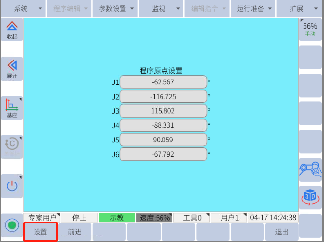 2. 將機(jī)器人移動到所需的程序起始位置。導(dǎo)航到運(yùn)行準(zhǔn)備 -> 零點設(shè)置 -> 程序原點,按“設(shè)置”按鈕,將機(jī)器人當(dāng)前位置設(shè)置為程序原點