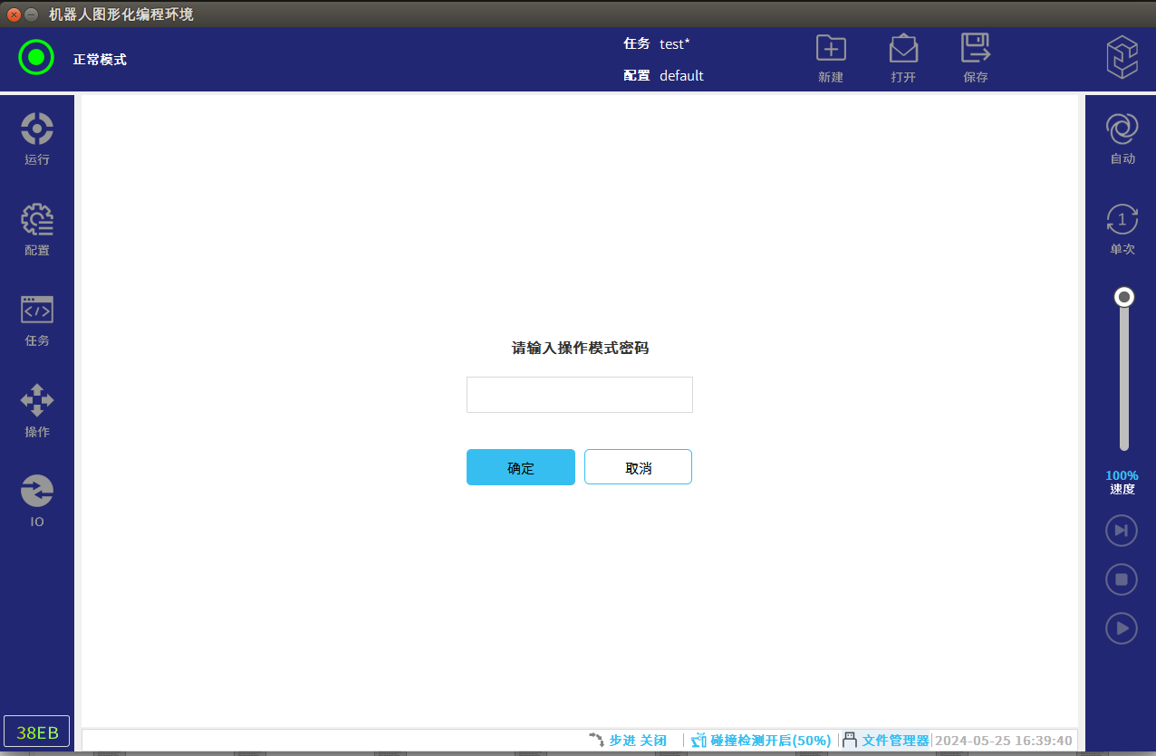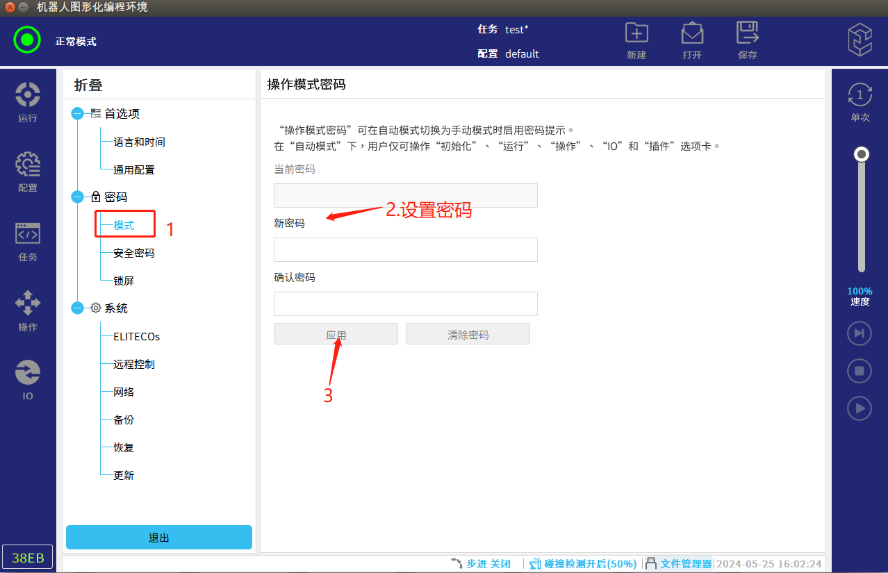 在手自動模式切換中,從自動模式切換成手動模式需要輸入之前設(shè)置好的密碼,所以密碼一定要記住,如果忘記了可以聯(lián)系ELITE機器人售后進(jìn)行清除重新設(shè)置