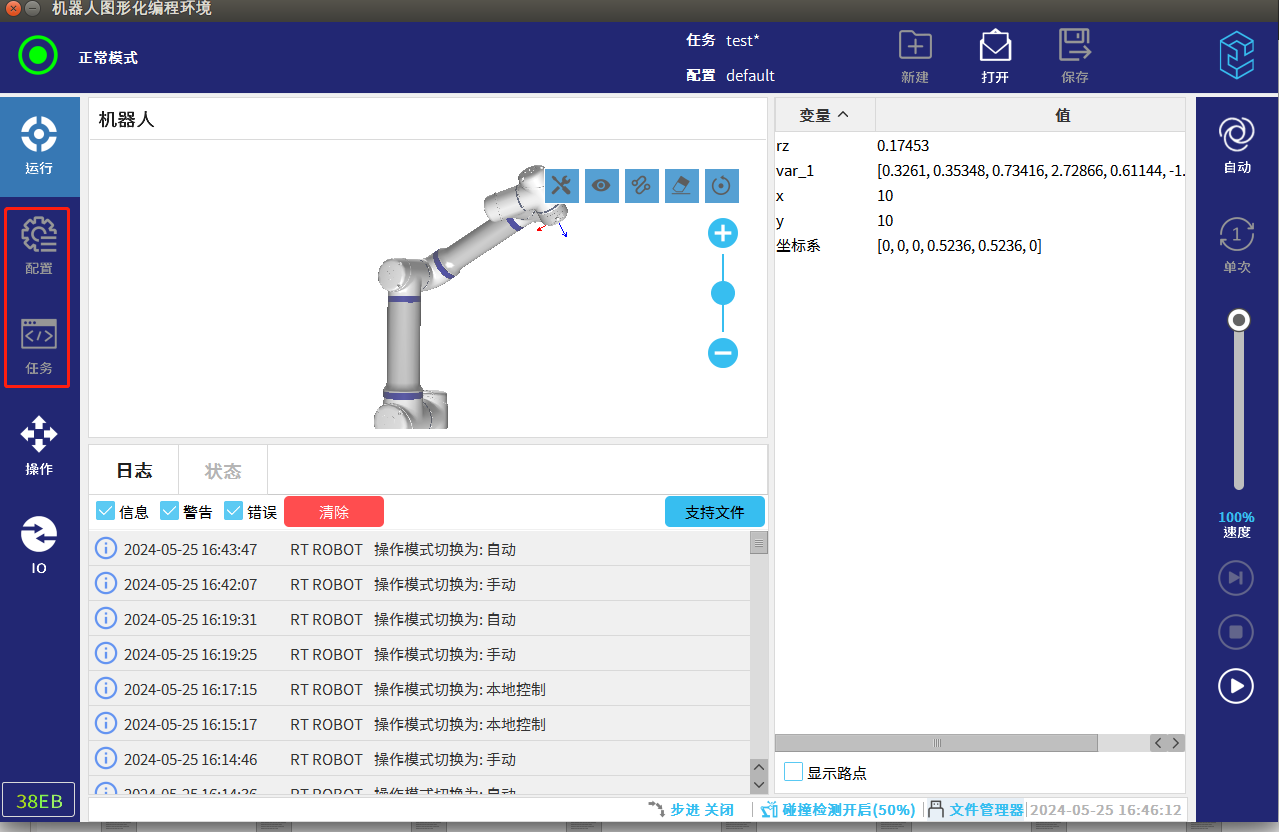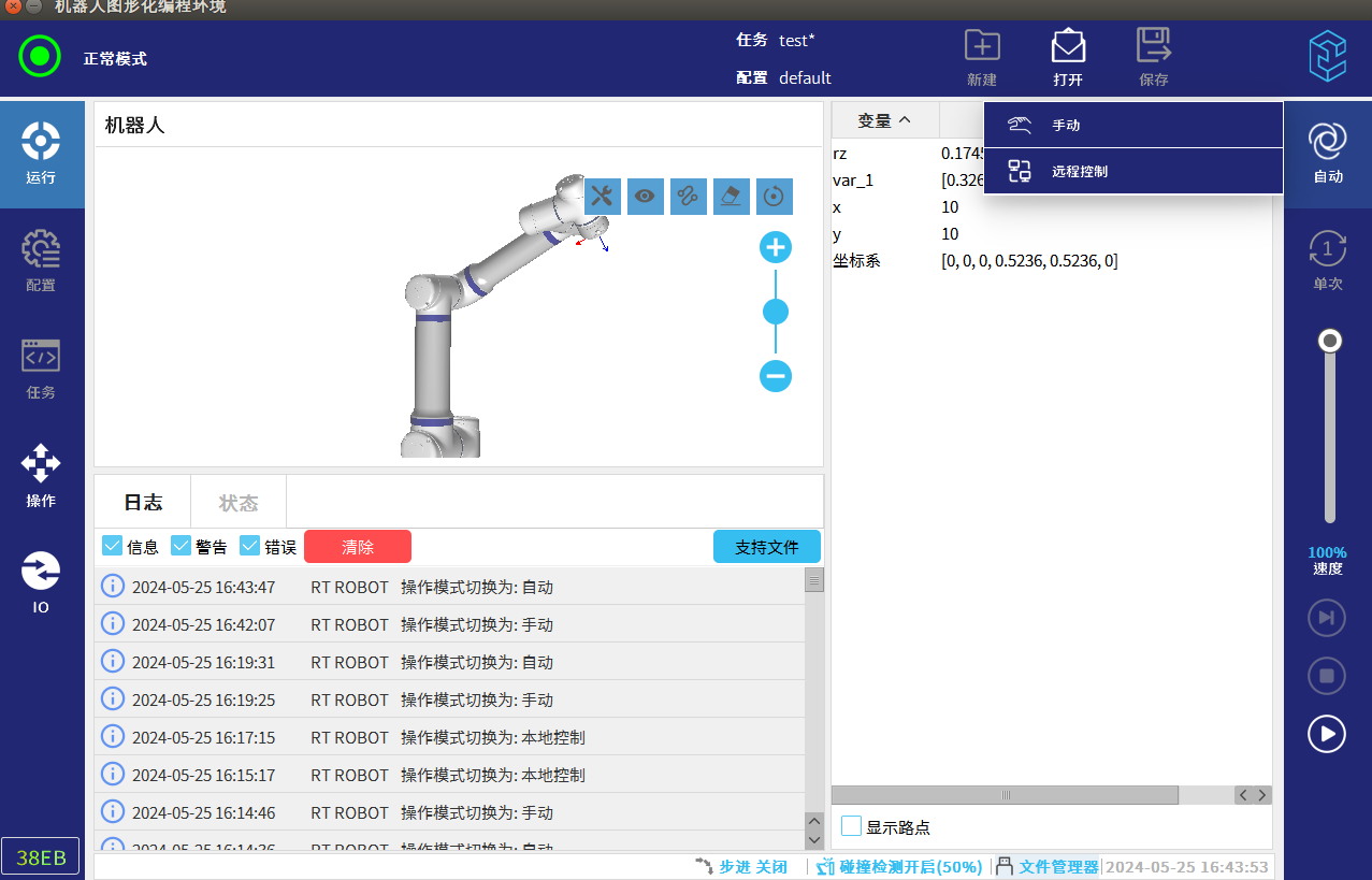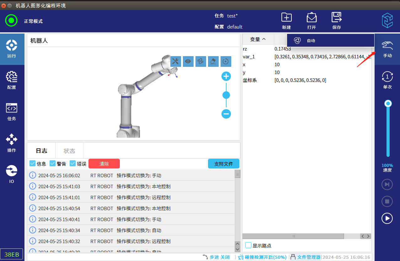 手動模式即機器人需要用示教器來控制機器人的移動,一般用于調(diào)試階段,進(jìn)行點位示教以及流程驗證