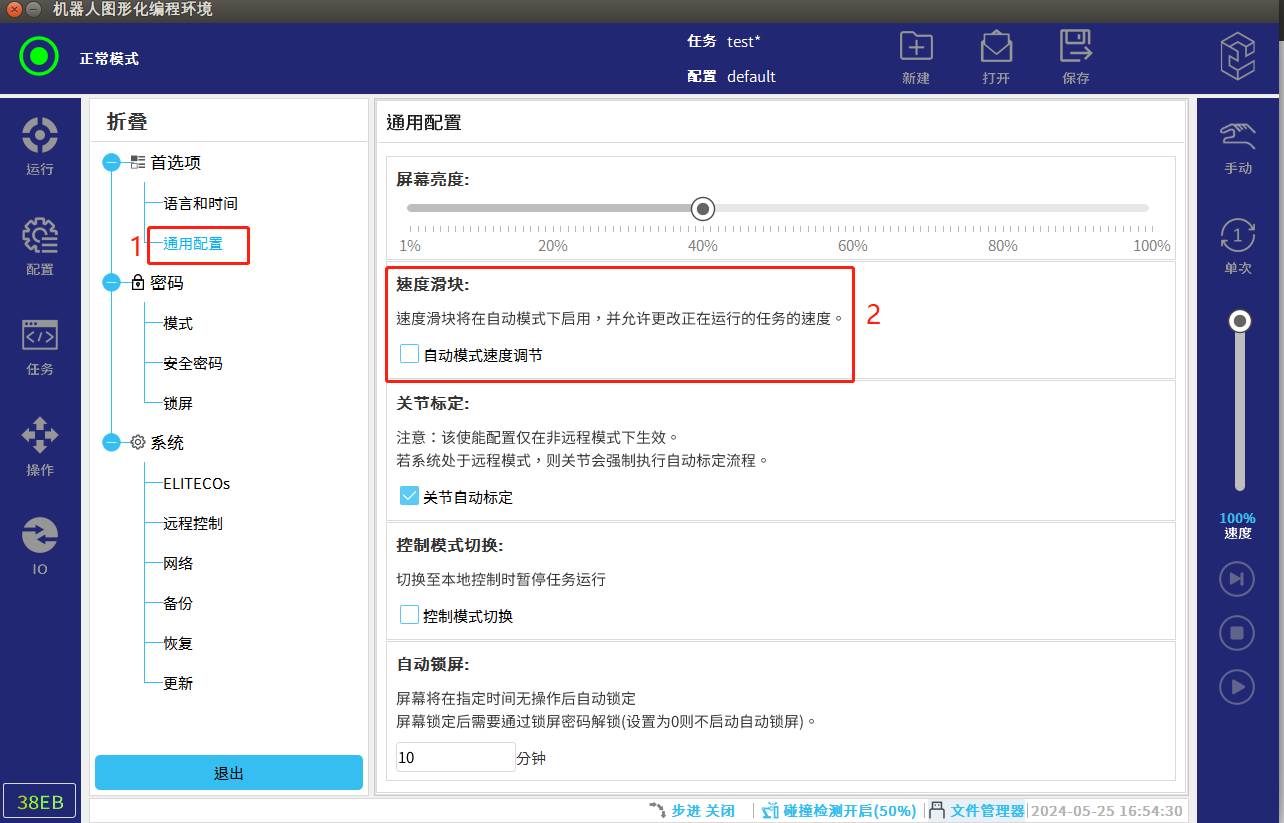 如果需要在自動模式下修改速度,則需要在設(shè)置模式的界面中選擇通用配置,勾選自動模式速度調(diào)節(jié),此時再切換成自動模式時,右邊的速度滑塊就可以進(jìn)行速度調(diào)節(jié)