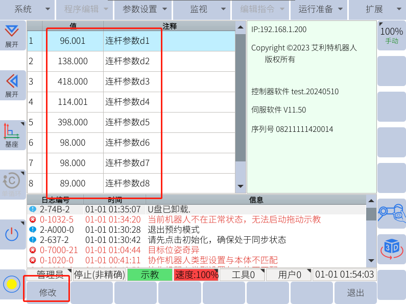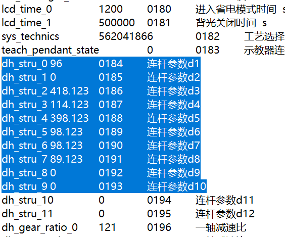 ②手動(dòng)查看原機(jī)器人dh記錄恢復(fù)后更改:參數(shù)設(shè)置--機(jī)械臂DH,點(diǎn)擊左下角可修改,斷電重啟保存