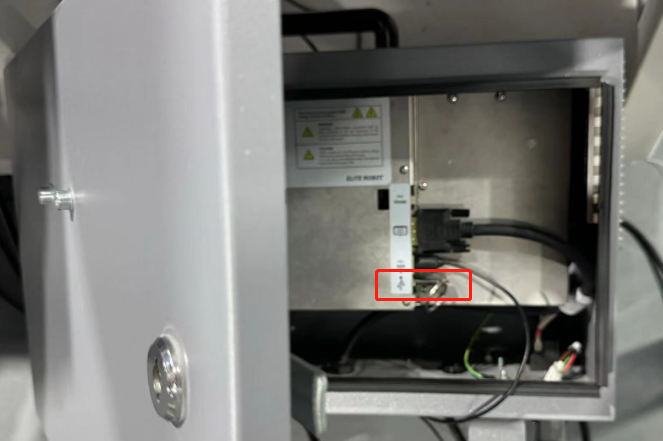 一般使用u盤進(jìn)行日志備份,建議將一個(gè)空U盤插入到機(jī)器人的usb接口上如圖:(需要打開控制柜)