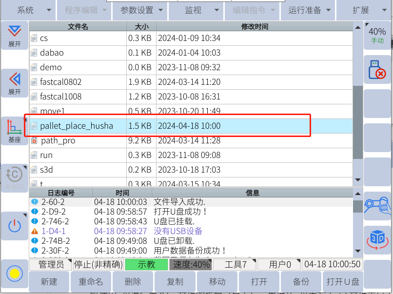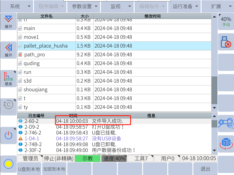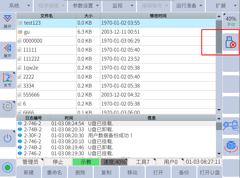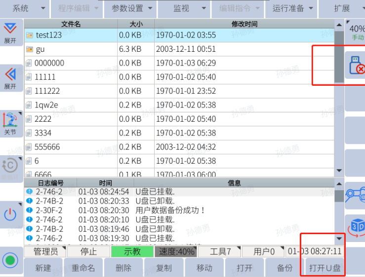 檢查示教器屏幕左上方是否彈出u盤圖標(biāo),